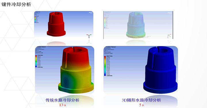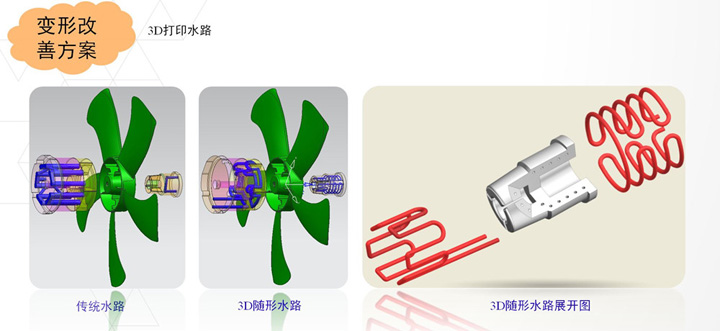 3D打印隨形水路使注塑件能夠快速冷卻,提高生產效率。仿真與生產相結合,讓產品更加完美。